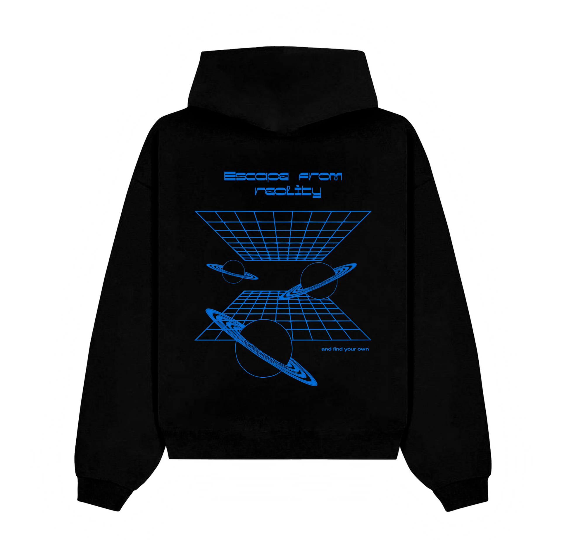 Black hoodie screen-printed in electric blue, carrying the words: "Escape from reality and find your own."