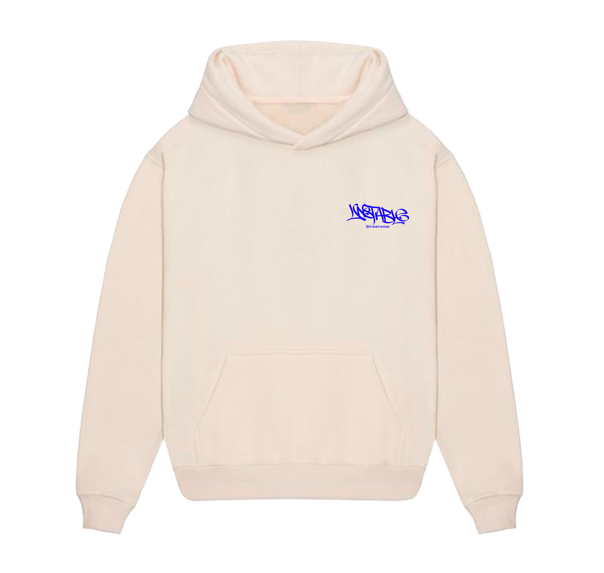 White hoodie screen-printed in electric blue, carrying the words: "Escape from reality and find your own."